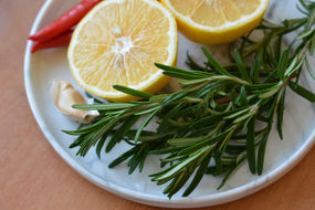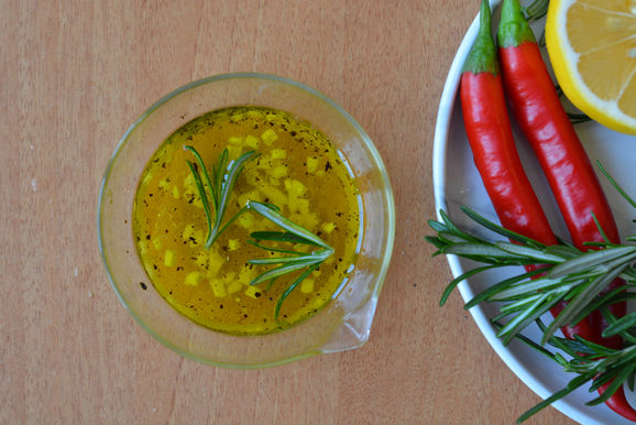 - Անցնենք սոուսի պատրաստմանը։ Սխտորը մանրացնել, ռոզմարինի տերևները առանձնացնել։ Գինին և ձիթապտղի ձեթը խառնել, ավելացել սխտորը, ռոզմարինի տերևներ, սև պղպեղ և խառնել։
