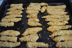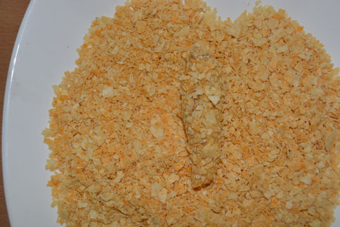Հավի կրծքամիսը լվանալ, կտրատել 2սմ. հաստությամբ ձողիկների: Համեմել աղով (0.5 կգ.մսին 1թ.գ. աղ), սև պղպեղով և հավի մսի համար նախատեսված ցանկացած համեմունքով, լավ խառնել, ավելացնել ձիթապտղի յուղ և մի քանի կաթիլ չիլի սոուս: Չիպսը մանրացնել: Ձուն հարել, ավելացնել 2 պտղունց աղ: Հավի կրծքամիսը թաթախել ալյուրի մեջ, ապա ձվի մեջ և վերջում մանրացրած չիպսի մեջ: Ջեռոցի ամանի մեջ մի քիչ բուսայուղ քսել, մեջը դասավորել հավի ձողիկները և եփել ջեռոցում 20-25 րոպե 200 աստիճանում: